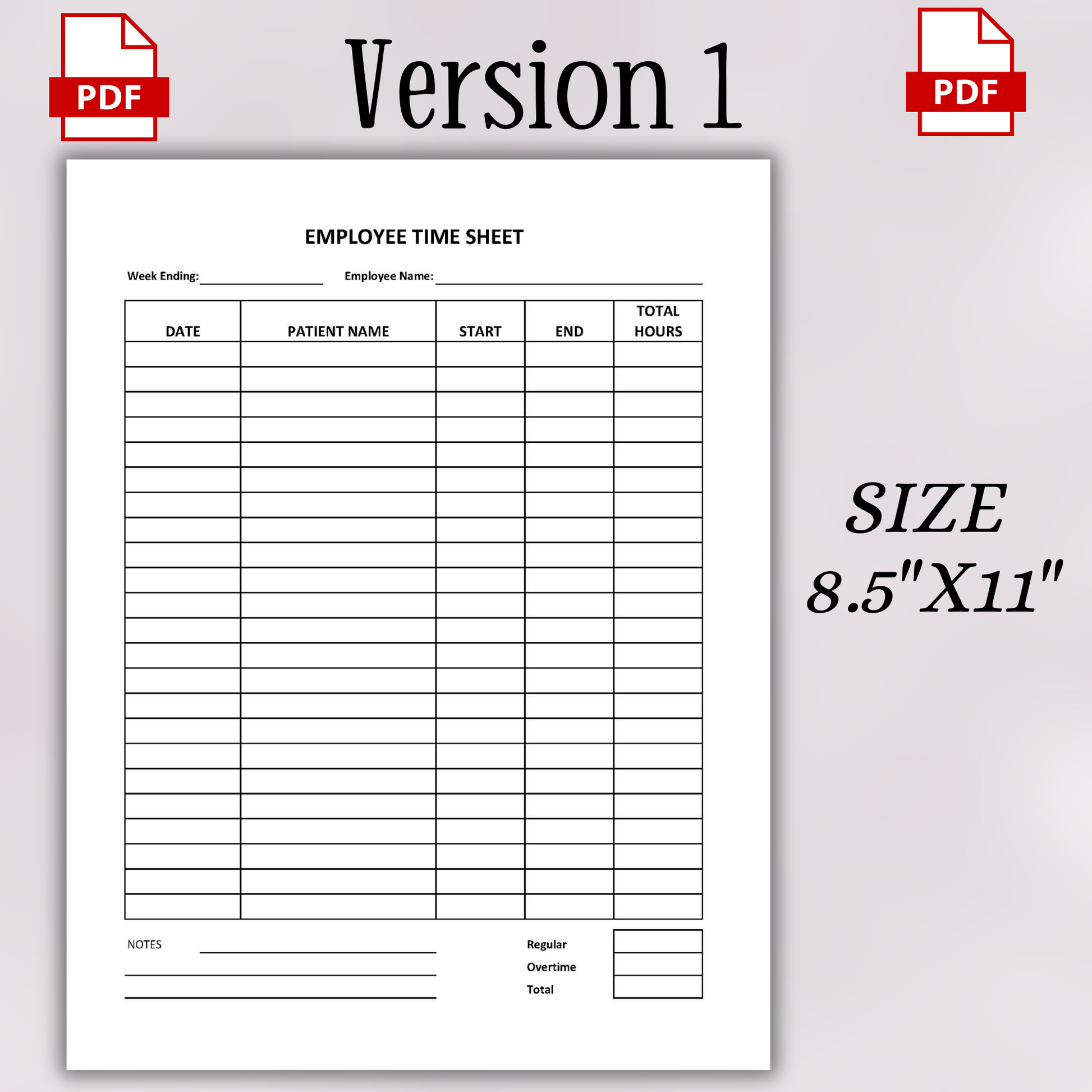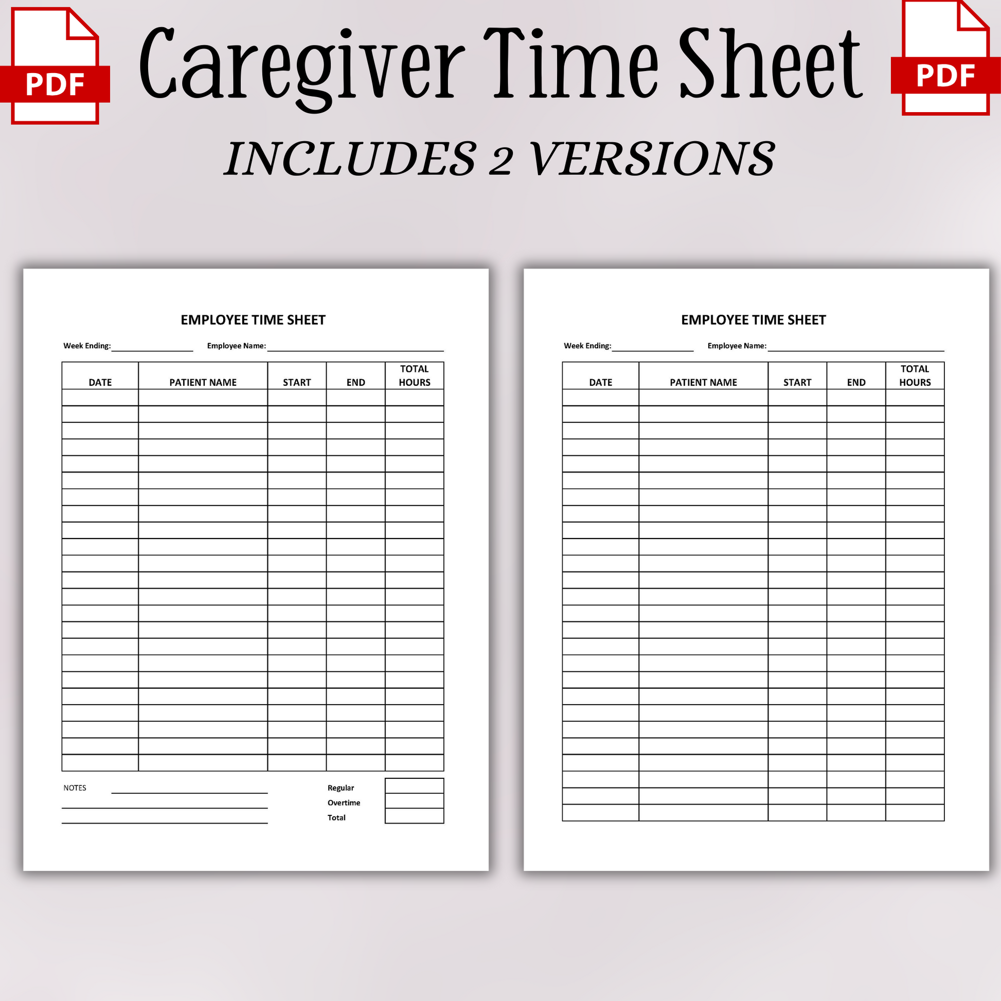 Two versions of the Caregiver Time Sheet are included with this purchase. The first version has a space to total the hours at the bottom, as well as a section to write notes. The second version provides additional space to fill in time.
